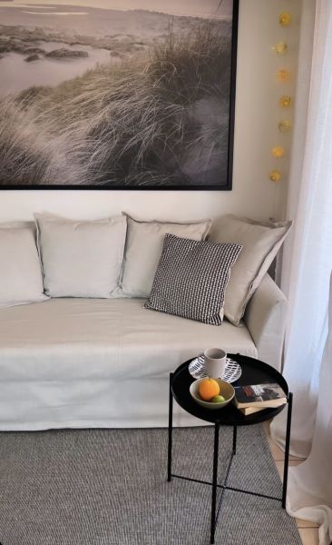 - Salon – salle à manger avec 1 canapé convertible pour 2 personnes, TV, 1 table et 4 tabourets